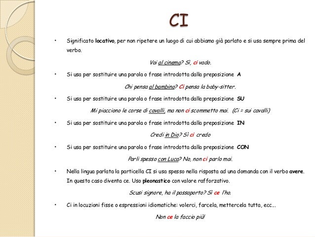 Le particelle ci e ne - Italian Online Lessons Le particelle ci e ne si usano al posto di una parola o una frase. Particella Pronominale Ci CI una particella che ha la funzione di pronome. Particolarità dei pronomi personali complemento Ci sono alcune particolarità dei pronomi personali complemento da tenere in considerazione per non sbagliare. - Quando il pronome non preceduto da preposizione - Quando non c necessità di sottolineare o enfatizzare il ruolo del pronome come complemento oggetto o complemento di termine. canzoni di SSC Napoli was founded in 19and the clubs most succesful stint was when Diego Armando Maradona played for them in the late 80s. Alaska Andalusia Arabia Saudita argentina Atene Australia belgio Brasile Cali California Canada Chateaunef-du-Pape Cina Colombia costa rica Croazia Danimarca Falciano del Massiccio Francia Germania ghana Giappone Grecia Honduras Inghilterra Iran Israele Italia kansas Mantova New York Nigeria Oklahoma Olanda Paraguay portogallo Providence Rhode.