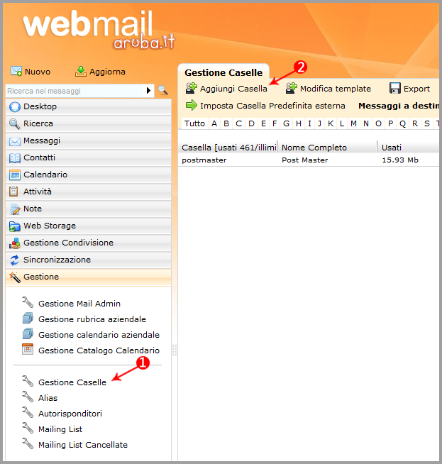 Come creare le caselle di posta del dominio - Per creare, modificare ed eliminare le caselle di posta del dominio, necessario effettuare il login alla Webmail utilizzando le credenziali della casella Postmaster ed accedere al Pannello aposGestioneapos.